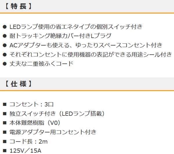 fk094igrjsLEDランプ使用の省エネタイプの個別スイッチがついています丈夫な二重被ふくコードです サイズ 個装サイズ:11×24×3cm 重量 個装重量:300g 生産国 中国 LED個別スイッチ付き節電タップ LEDランプ使用の省エネタイプの個別スイッチがついています丈夫な二重被ふくコードです
