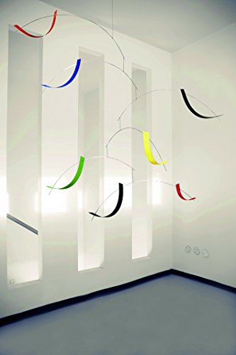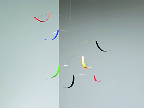 - An elegant mobile consisting of six wire arcs from which seven colored wings protrude. The design plays on the contrast between the upward curve of the wires and the downward curve of the wings. The mobile is delivered in the color combination as shown on the picture, but for your convenience we have added the following colors for you to change if you wish: The small: 1 extra yellow and 1 extra black The large "curves": 1 black, 1 green, 2 grey, 3 yellow, 3 red (subject to alteration).