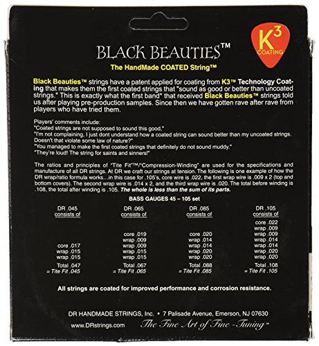 ReleaseDate : 2008-06-05 Studio : DR Music Publisher : DR Music Binding : Electronics Product Description DR's EXTRA-Life strings offer bass players superior black coated strings without sacrificing the crisp tone, clarity, and volume of traditional DR HandMade Strings. EXTRA-Life has a super thin advanced .0003" black coating on the plain strings and on the wrap wire?the thinnest coating DR knows of. Contemporary bass players, as well as bass makers, who demand a taper core string to enable modern bass playing techniques, will be delighted by the superior performance Taper Core bass strings deliver. Today's 4, 5 and 6-string bass players searching for increased stability in the lower registers will find great clarity and definition with DR's tapered bass strings. DR Taper Cores use a single wrap around the core as the narrow winding passes over the bridge.. 0