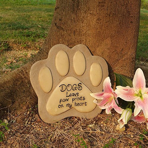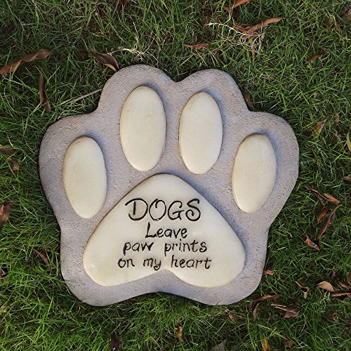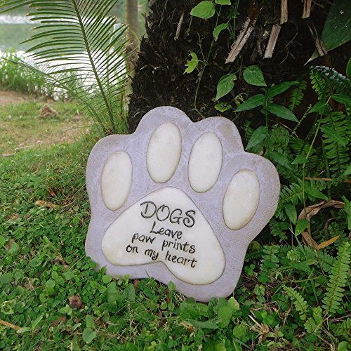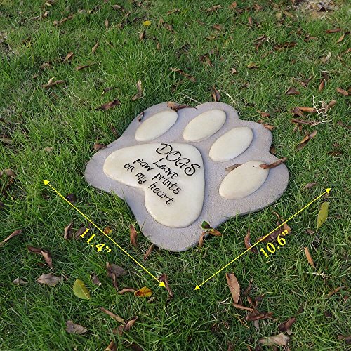 DOGS LEAVE PAW PRINTS ON MY HEART - This inspirational quote and the luminous footprint mark are engraved on an 11.4” sculpted resin bereavement stone that can be used outdoor as a garden marker or pet headstone.