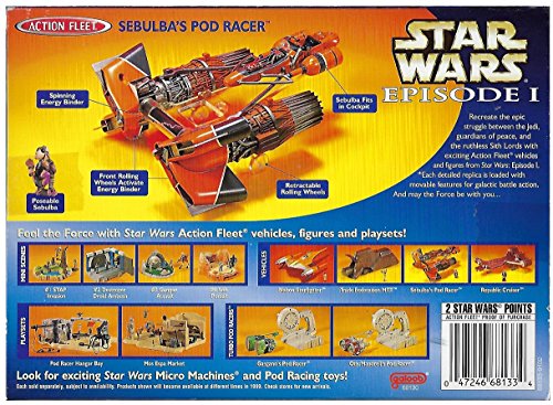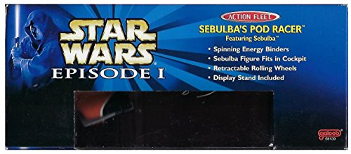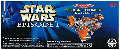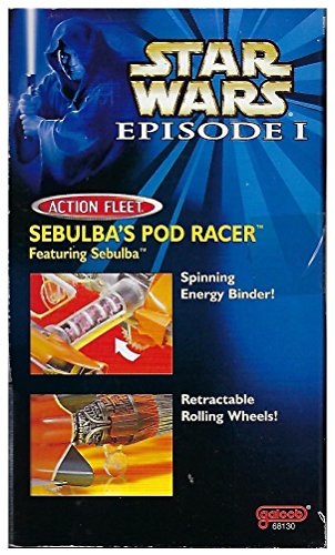 -. Binding : Toy -. Brand : Hasbro -. EAN : 0047246681334 -. Feature : Replica of Sebulba's pod racer made of sturdy plastic / The energy binder spins when the pod racer's retractable wheels roll / The cockpit can be moved forward or backward on the engine / Posable Sebulba figure fits inside the cockpit and holds the pod racer's controls / Suitable for ages 4 years and over -. IsAdultProduct : 0 -. Label : Galoob Toys -. Manufacturer : Galoob Toys -. Model : 6356473 -. MPN : 68130 -. PackageQuantity : 1 -. PartNumber : 68130 -. ProductGroup : Toy -. ProductTypeName : TOYS_AND_GAMES -. Publisher : Galoob Toys -. Studio : Galoob Toys -. Title : Star Wars Episode I: Action Fleet - Sebulba's Pod Racer Featuring Sebulba -. UPC : 047246681334