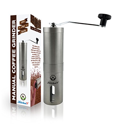 -. Feature : EASY TO USE: Equipped with a user-friendly cranking handle, our manual coffee grinder is impressively efficient and quite easy to use. Place whole beans into the chamber, crank and in just seconds you will have perfect grounds for brewing coffee, espresso or cappuccinos / EASY TO CLEAN: Made out of top quality 304 stainless steel, this manual coffee grinder is conveniently dishwasher-safe / UNIVERSALLY COMPATIBLE:The KitchenV Manual Coffee Grinder is 100% compatible with ANY coffee, espresso or cappuccino brewing machine, including the Aeropress, Turkish coffee makers, French presses, coffee drippers and so much more. / PERFECT FOR CAMPING: Take it with you for camping / ADJUSTABLE GRIND SIZE: The unique grind adjustment feature allows you to adjust the coarseness of the grind according to your needs or preference. A coarser grind is ideal for coffee, while a fine grind is recommended for espresso