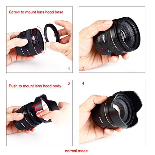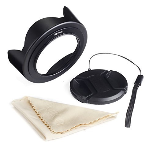 Lens hoods are one of the most important accessories you can purchase to improve the quality of your photos. It can help prevent those circles of light that can accompany images where a strong light source is just outside the frame.SO WHY US?- This is a reversible tulip lens hood compares to normal lens hood. Facing the lens hood OUT when shooting and facing it IN when you want to store your camera in a bag with no wasted space. It can protect your lens when facing in.- This reversible flower lens hood uses special metal clip mounting method than other hood which usually uses screw mounting. This makes it much easier and quicker for detaching and mounting the hood body. Please check the images at the top of the page for instructions on how to mount and detach the lens hood.- The only lens hood on the market that lets you use a lens cap while having your hood mounted. Super quick and easy release.- Comes with our unique center pinch lens cap with cap keeper leash. The only lens cap that offer premium quality and protection as original manufactory while solved the easily losses problem.- Also comes with our premium microfiber cleaning cloth, extremely fine microfiber leaves zero scratches, streaks or marks. Safe for all lenses.Package Contains:- 58MM Reversible Tulip Flower Lens Hood x 1pcs;- 58MM Center Pinch Lens Cap with Cap Keeper Leash x 1set;- 6''x7'' (15cm x 18cm) Premium Microfiber Cleaning Cloth x 1pcs;?