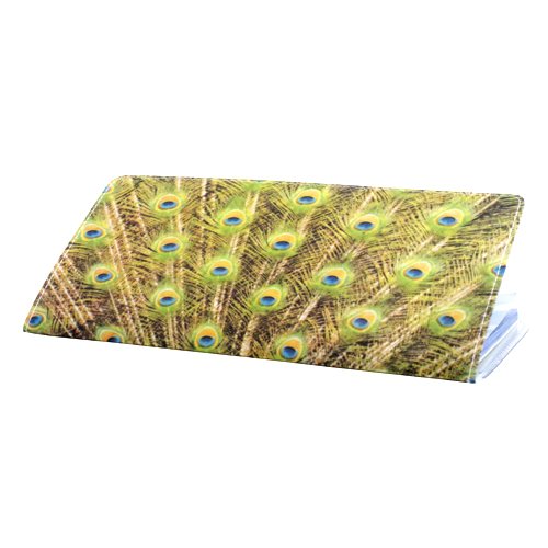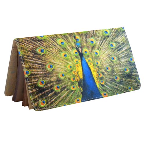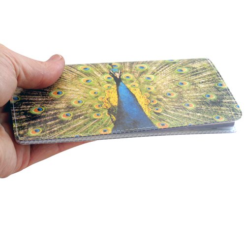 Binding : Apparel Product Description The peacock has been a symbol of beauty and prosperity for all time. This proud peacock design keeps your identity shielded so your privacy is insured in public and also reminds you of your every flowing prosperity! A Practical and handy checkbook cover-case, it can also double as a slim wallet. Measures 6 3/8" x 4 3/8" when closed, with two clear pockets inside. Handmade in Los Angeles. 0