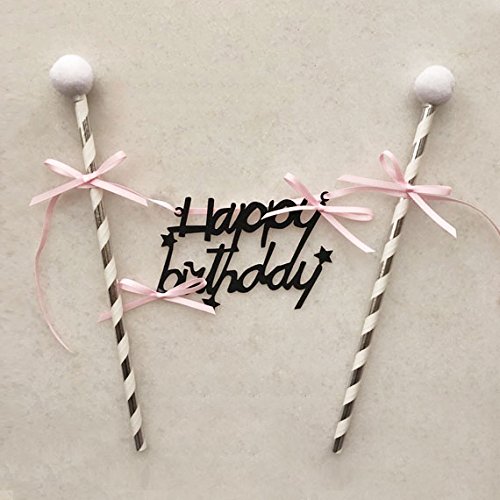 Happy Birthday Cake Bunting Topper Cake Topper Banner Garland Cake Flags, Black Felt Happy Birthday Pink Bows Silver and White Striped Paper Straws with White Pom Poms, Handmade and Highest Quality