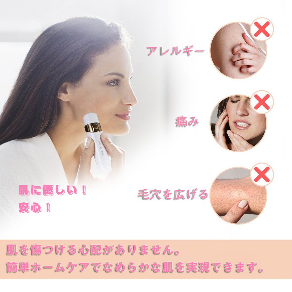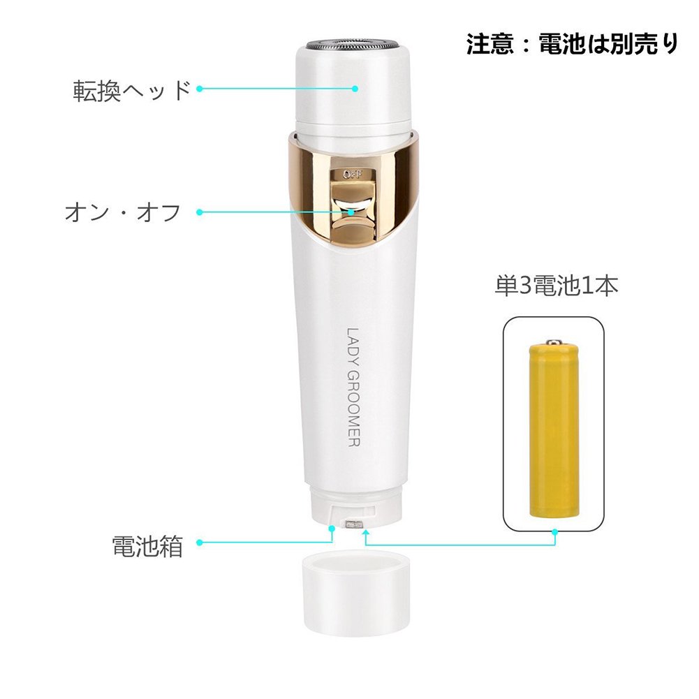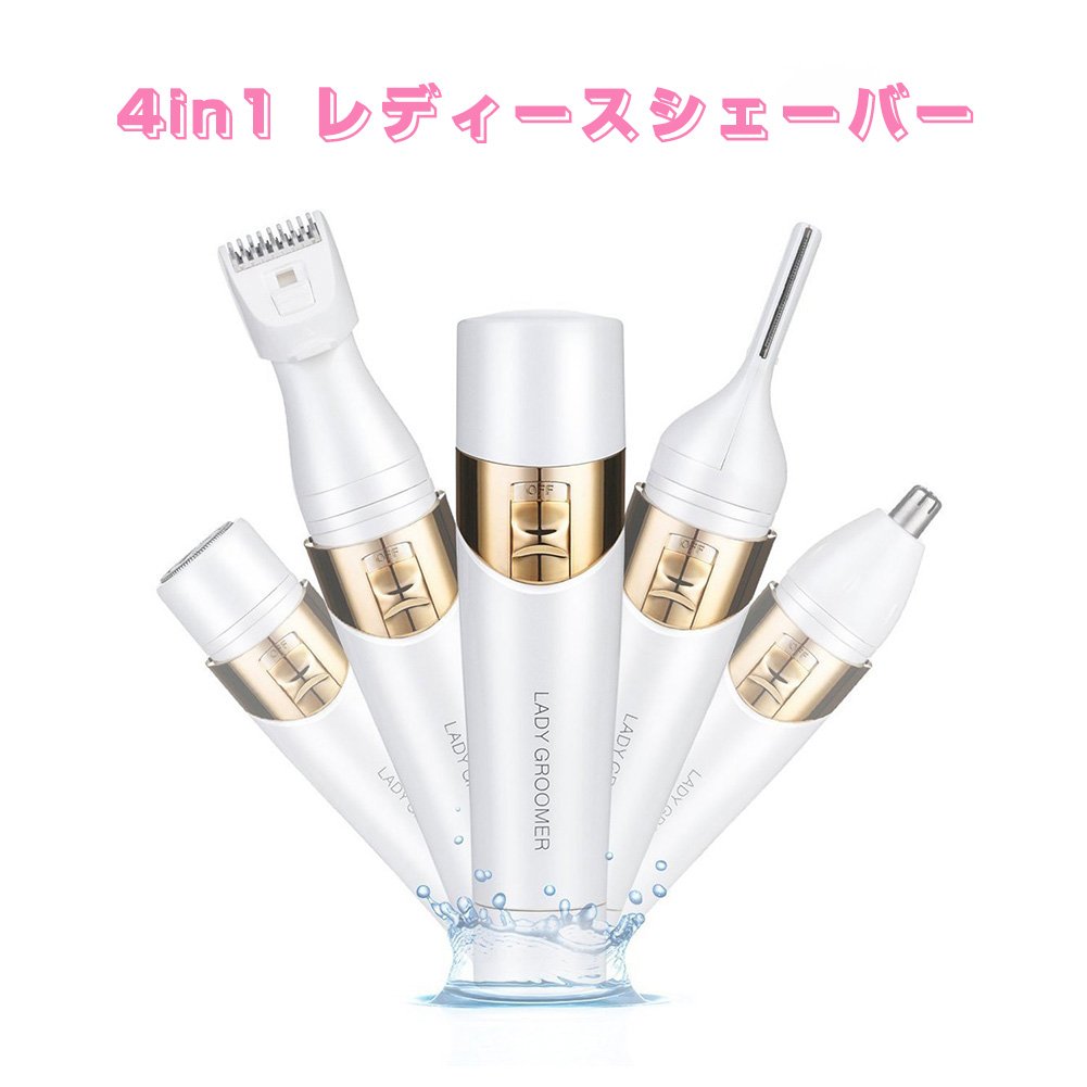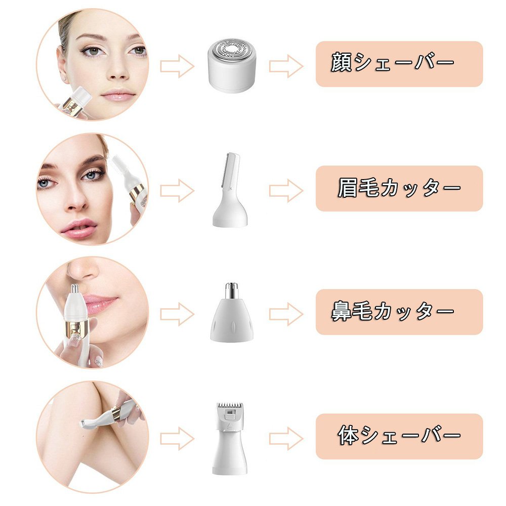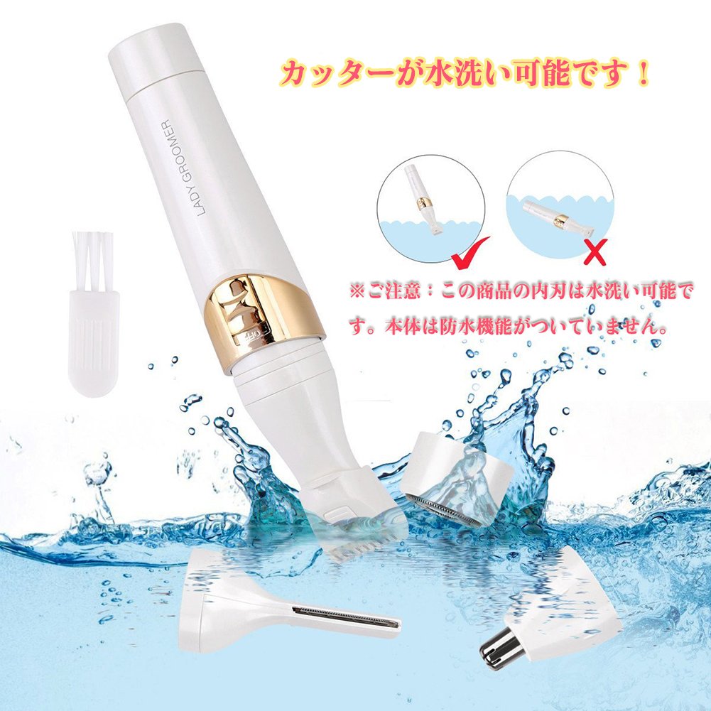 This product is a battery type lady shaver with nose hair cutter, eyebrow cutter, shaver, epilator for whole body, four functions.