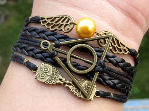 Joyplancraft Unique Lengendary Bracelet Golden Snitch Deathly Hallows and Owls Charm with Black Leather Braid and Rope Bracelet