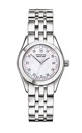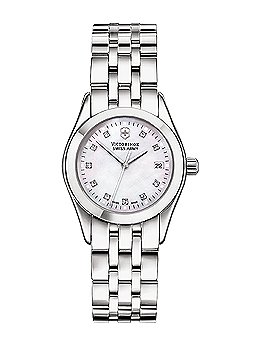 Stainless steel case with a stainless steel bracelet. Fixed bezel. Mother-of-Pearl dial with luminous hands and Diamond hour markers. Quartz movement. Scratch resistant scratch resistant sapphire crystal. Water resistant at 100 meters / 330 feet.