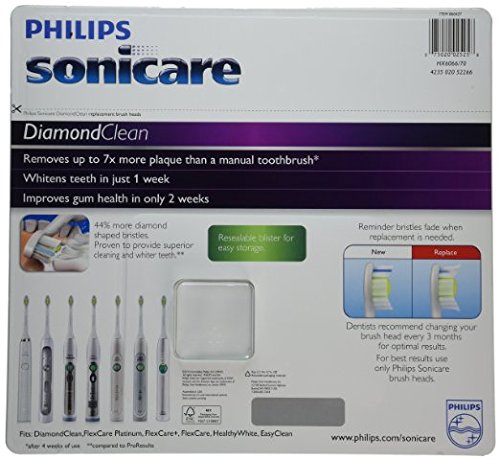 Diamond-Shaped Bristles Remove More Plaque With 44 percent more bristles than ProResults Standard, DiamondClean toothbrush heads remove more plaque deep between teeth and along the gum line to decrease your risk of gingivitis. The diamond shaped bristles of the brush head gently clean and whiten teeth by removing surface stains and buildup. The DiamondClean brush heads remove up to 5x more plaque than a manual toothbrush. Replace Every Three Months You can't see it, but your brush head wears over time. Blue reminder bristles fade in color to let you know when it's time to replace the brush head. Dental professionals recommend replacing your brush head every three months. Sonicare technology helps you remove up to two times more plaque compared to a manual toothbrush. The DiamondClean Standard brush head works with the following Sonicare models: DiamondClean, FlexCare+, FlexCare, HealthyWhite, and EasyClean. The heads easily snap onto handles and come with caps for hygienic storage and travel.Feature