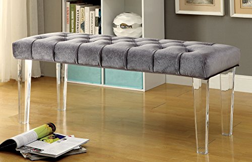 -. Feature : Contemporary style; Gray flannelette fabric / Padded flannelette upholstery with deep button tufting / Supported on strong and Sturdy, clear Acrylic legs / Measures 48 inches long by 18 inches wide by 20 inches high; 30-days hassle-free replacement parts warranty