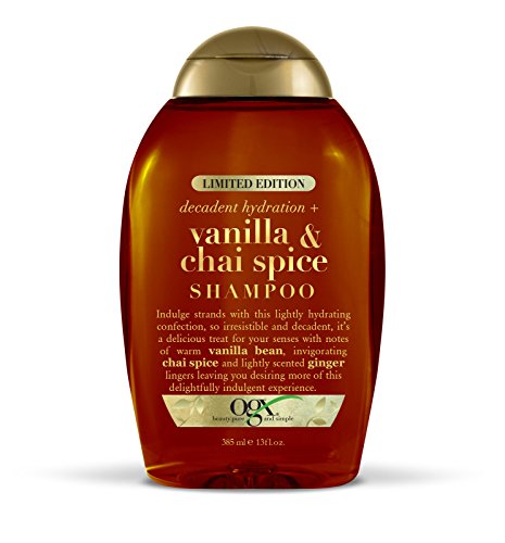 OGX Limited Edition Decadent Hydration + Vanilla & Chai Spice Organix Hair Shampoo 13oz (Quantity 1) Indulge strands with this lightly hydrating confection, so irresistible and decadent, it's a delicious treat for your senses with notes of warm vanilla bean, invigorating chai spice and lightly scented ginger lingers leaving you desiring more of this delightfully indulgent experience. OGX Decadent Hydration + Vanilla & Chai Spice Shampoo is perfect to get you and your hair ready for the New Year and celebrate new hair beginnings.