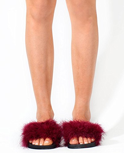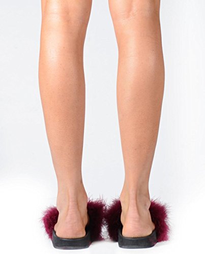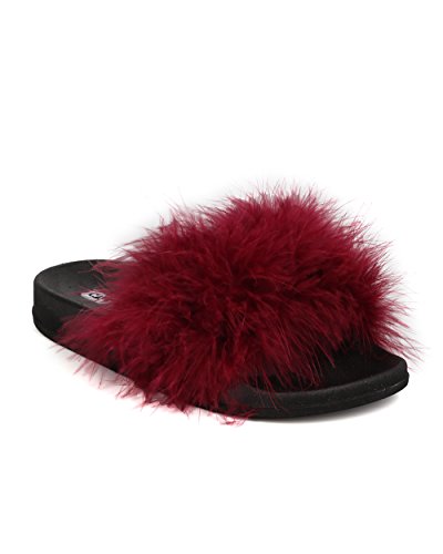 Cape Robbin Moira-2 Women Flip Flop Marabou Fur Slide Slip On Flats Sandals Shoe Slipper Wine