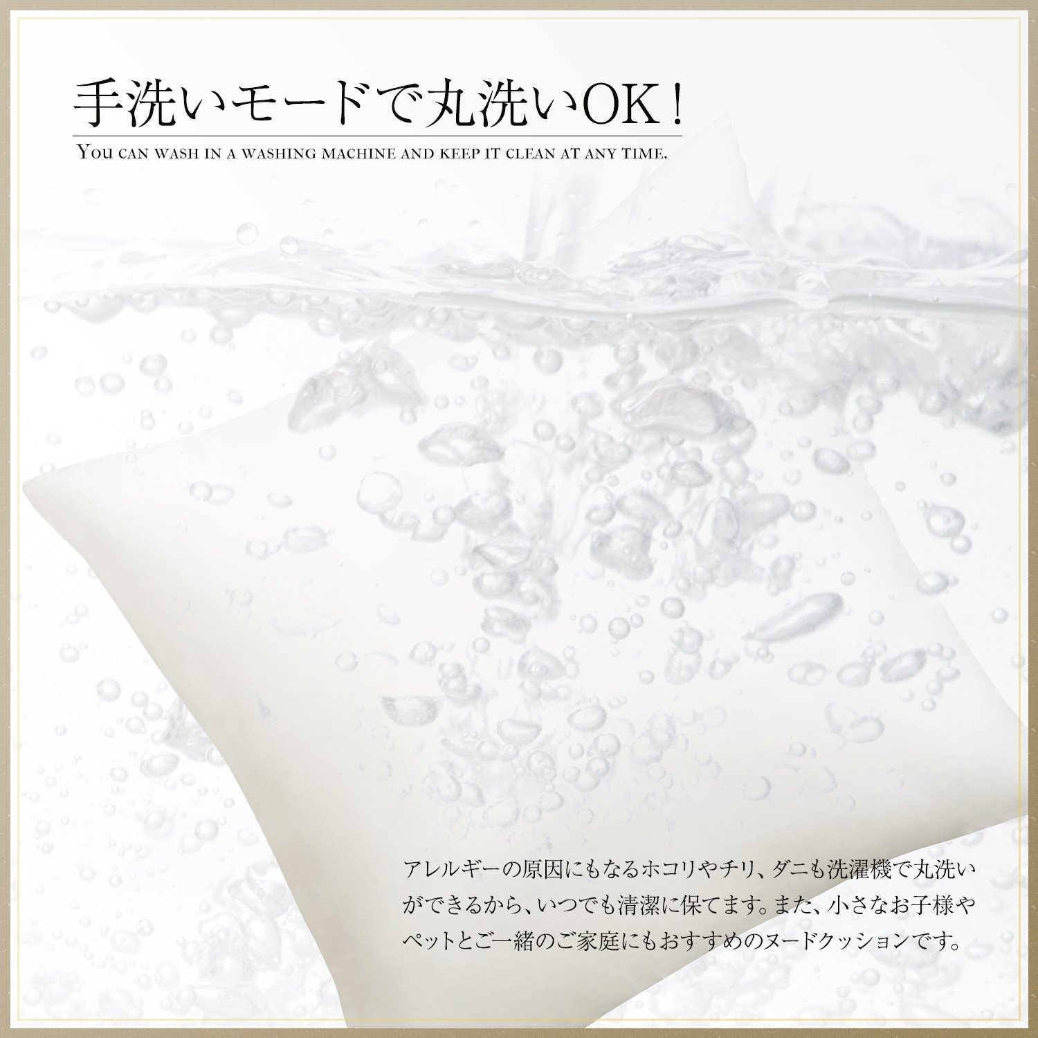 【洗濯機で手軽に洗える】お肌に身近に触れるクッションは中身も清潔に保ちたいもの。このクッションは洗濯機(手洗いコース)で洗えるので、小さなお子様やペットとご一緒のご家庭にもおすすめです。脱水後は、風通しの良い日陰で置き干しし、よく乾かしてください。
