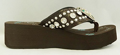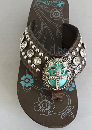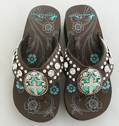 Binding : Apparel Product Description Montana West brand spiritual collection western women's flip flops. Wide textured PU leather strap with comfort cushioning on the inside. Decorated with rhinestones, silver embellishments and a large 2" turquoise stone concho in the center, overlaid with a rhinestone encrusted pewter cross. Wedge style, heel height 1 ¾". Comes with a shoe box. 0 |