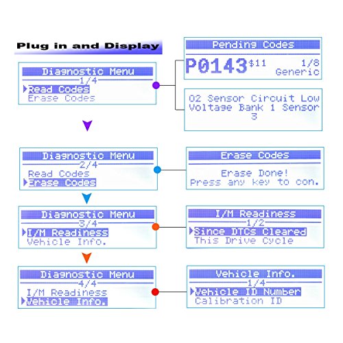 - I/M MONITOR READINESS TEST: It can turn off the MIL and view freeze frame data, read code and show the definition of the fault code directly, it also retrieves vehicle information (VIN, CIN and CVN).