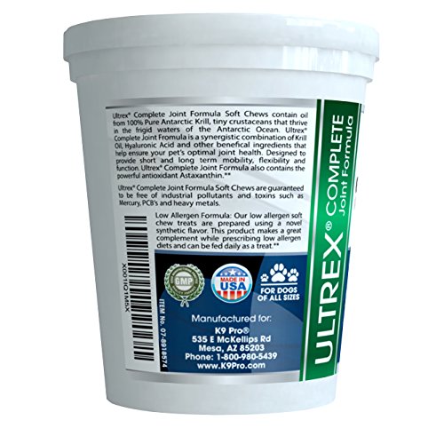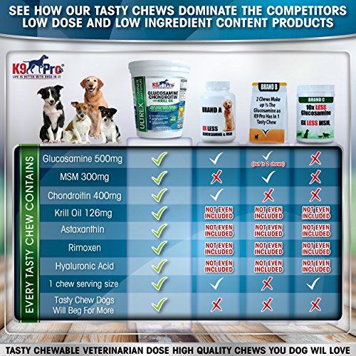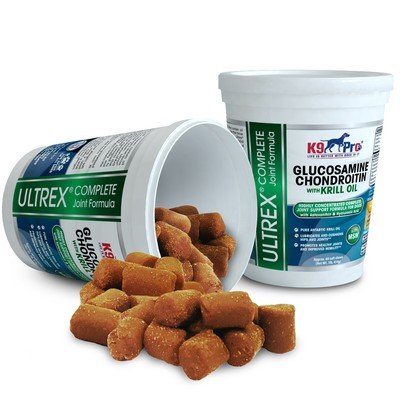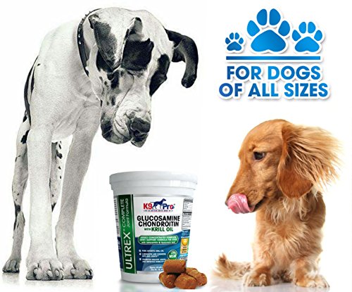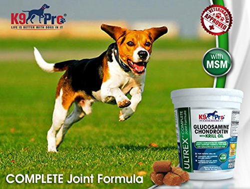 YOUR DOG IS A LOVING MEMBER OF THE FAMILY - DON'T THEY DESERVE THE BEST CARE? MOST OTHER GLUCOSAMINE FOR DOGS JOINT SUPPORT SUPPLEMENTS HAVE ONLY A SMALL DOSE of GLUCOSAMINE & NOT MUCH ELSE - While K9 PRO ULTREX GLUCOSAMINE FOR DOGS joint supplement for dogs - contains high levels glucosamine Chondroitin and MSM PLUS Krill Fish Oil for Dogs - a top arthritis pain relief ingredient for hips, back, shoulder, and all canine joints
