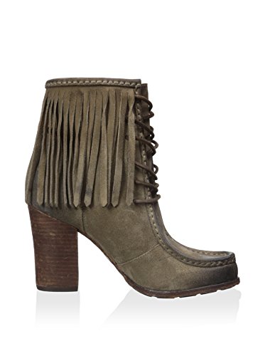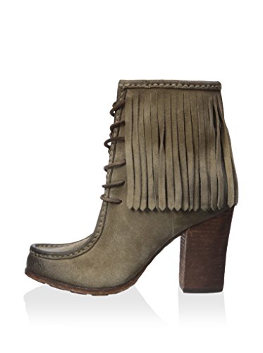 Soft fringe flows from the top line of these modern, moccasin-inspired Frye booties. Dark burnishing at the edges creates a worn effect. Lace-up closure. Scuffed, stacked heel and rubber-trimmed leather sole.