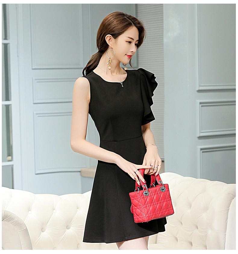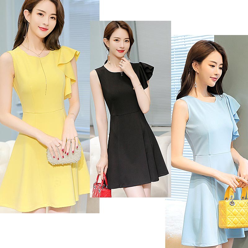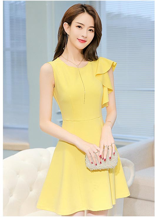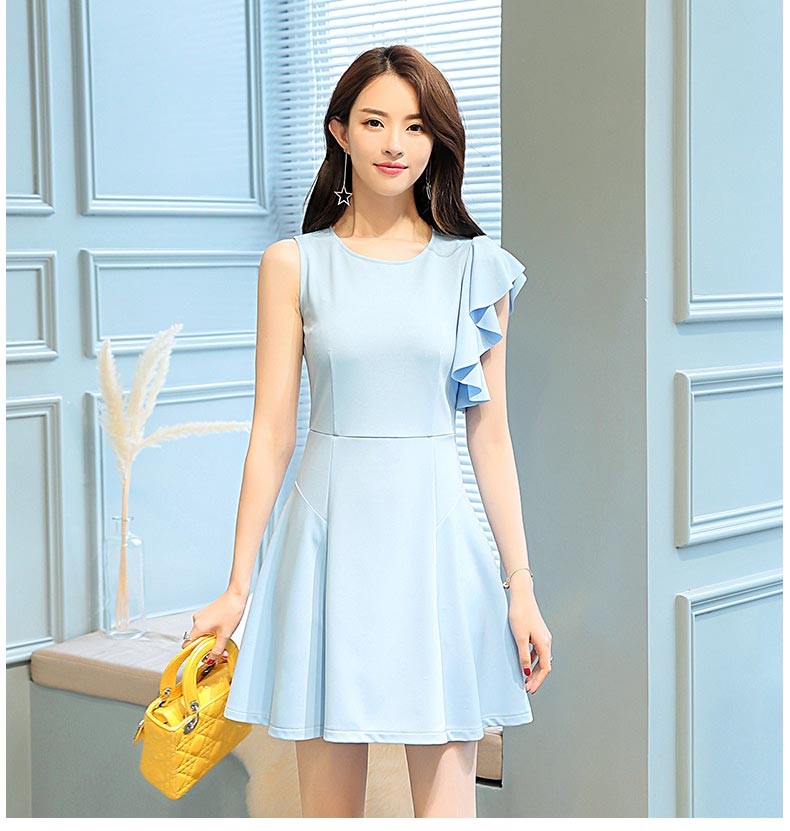ラウンドネック・ノースリーブ・ひざ上丈のアシンメトリー肩フリルワンピース♪