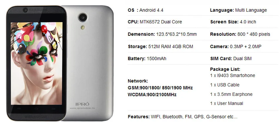 Original IPRO 4.0inch Celular Android 4.4 MTK6572 Dual Core Mobile Phone Ram 512M Rom 4G Dual SIM Smartphone WCDMA 1200mAh