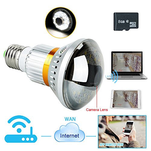-. Feature : ★ MOTION DETECTION & INFRARED: to save on memory space and electricity, the spy bulb's hidden camera can be set to record only when motion is detected. It is also equipped with infrared capabilities, which helps it capture the scene even when there is no light in the room, keeping you informed of any happenings in the dark of night. / ★ MOST PRACTICA: support smartphone tablet APP remote view and control; support PC computer view and control; email alert; 7/24 hours non-stop recording; support 32GB micro SD card in Max(8GB SD card included); circle storage; 5Watt white light / ★ WIFI WIRELESS: Wifi IP network function. Disguised as a family bulb, this Wi-Fi IP camera transmits secure, interference free, video signal directly to your wireless router for remote viewing and recording. / ★ HIDDEN CAMERA: mirror bulb P2P Wifi AP IP camera,(Not a real lamp) motion activated security hidden camcorder DVR, real-time audio & video recording, IR night vision , mirror cover / ★ HIGH DEFINITION: spy mirror bulb produces 1280x960 Full HD video so recorded events are always crystal-clear
