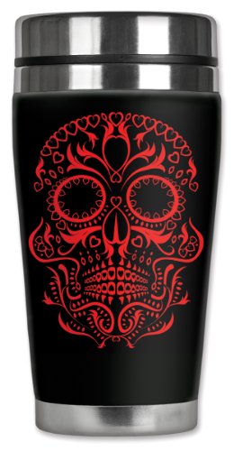 Mugzie Red Sugar Skull Travel Mug with Insulated Wetsuit Cover, 16 oz, Black