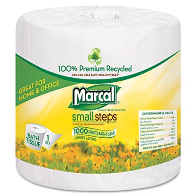 Studio : MARCAL MANUFACTURING, LLC Publisher : MARCAL MANUFACTURING, LLC Binding : Electronics Product Description 100% recycled, long-lasting bath tissue, one-ply white. Individually wrapped rolls in each case. Septic safe. Whitened without chemicals and no added dyes or fragrances. Tissue Type: Toilet; Number of Plies: 1; Number of Sheets: 1000 per roll; Length: 4 1/10\." 0