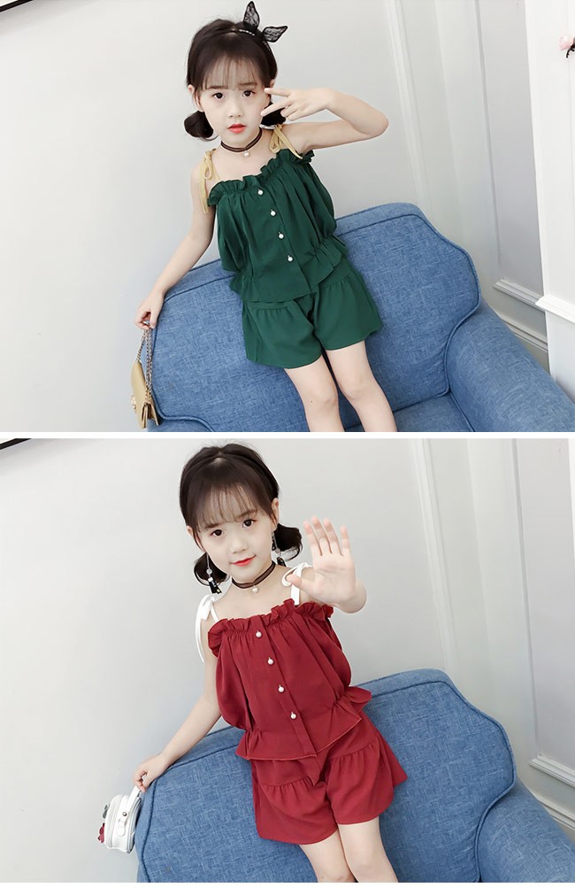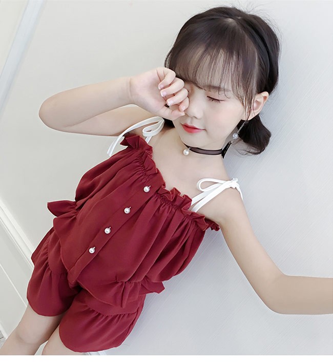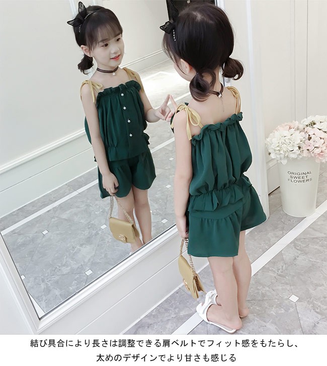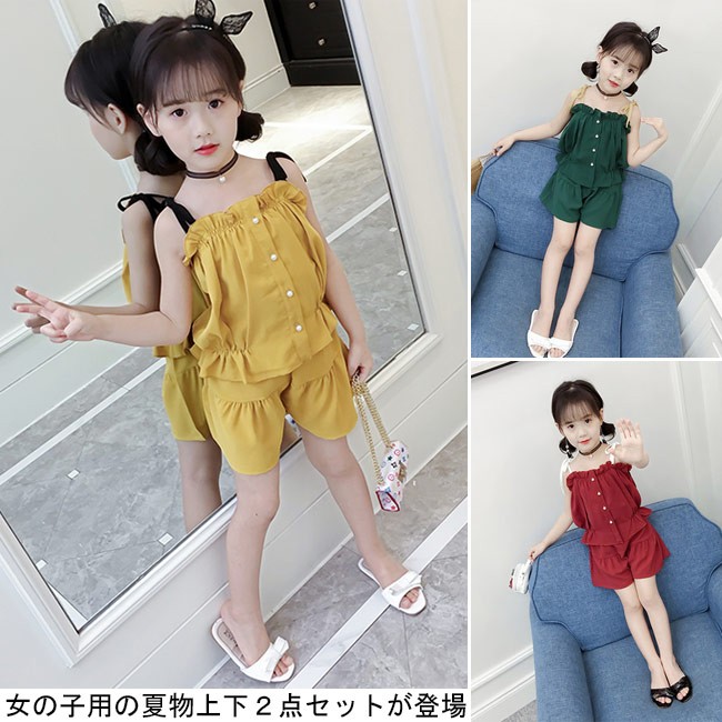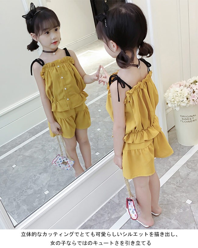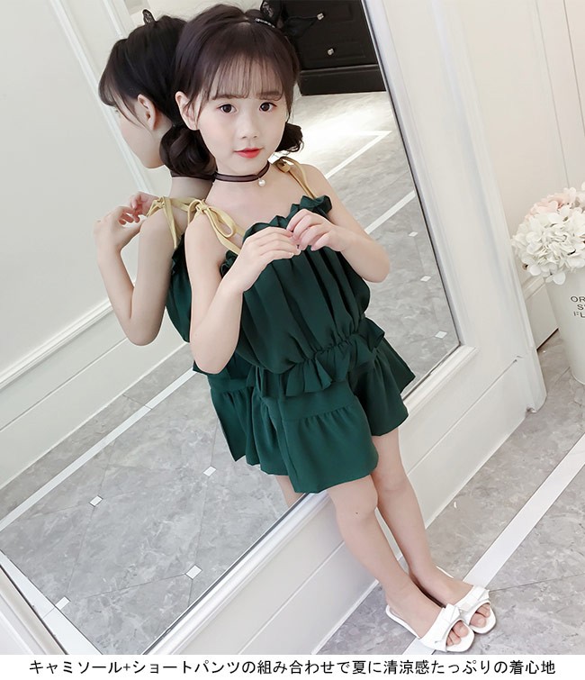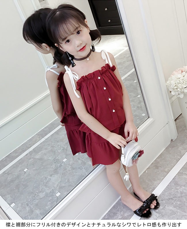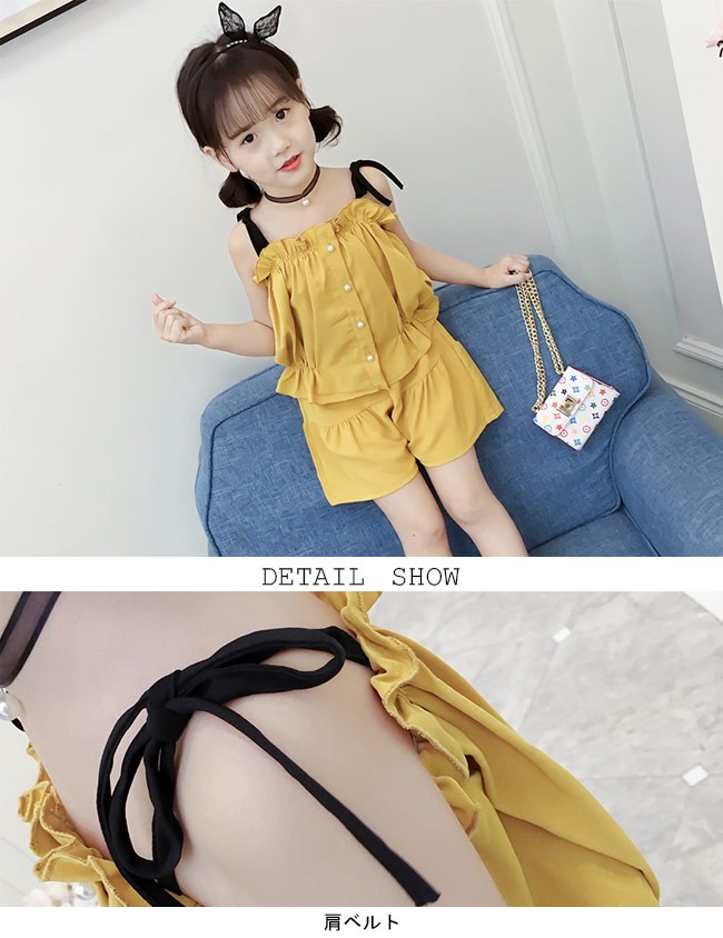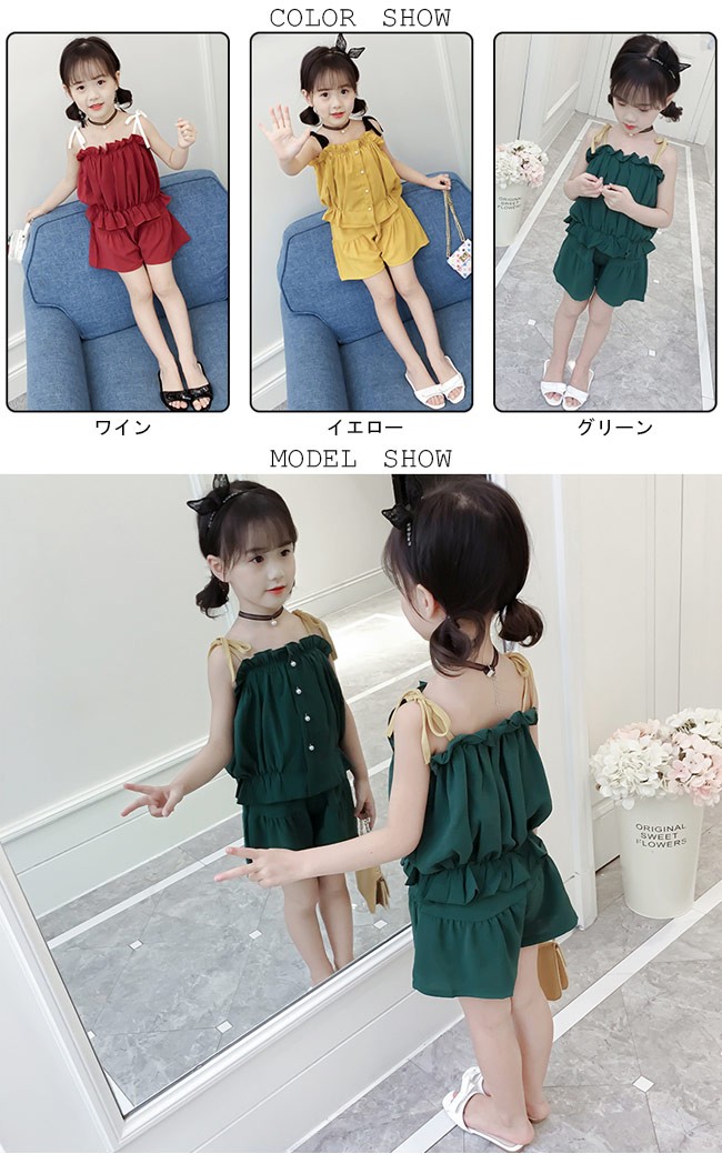 子供服 2点セット 女の子 キャミソール 肩ベルト調整可 フリル 女児 ショートパンツ ウエストゴム キッズ 夏物 セットアップ レトロ女の子用の夏物上下2点セットが登場キャミソール+ショートパンツの組み合わせで夏に清涼感たっぷりの着心地立体的なカッティングでとても可愛らしいシルエットを描き出し、女の子ならではのキュートさを引き立てる襟と裾部分にフリル付きのデザインとナチュラルなシワでレトロ感も作り出すカラー:ワイン イエロー グリーン素材 ポリエステルサイズ(cm) 100 110 120 130 140 150100 トップス 着丈(肩ベルト含まず)24 パンツ 総丈24110 トップス 着丈(肩ベルト含まず)26 パンツ 総丈26120 トップス 着丈(肩ベルト含まず)28 パンツ 総丈28130 トップス 着丈(肩ベルト含まず)30 パンツ 総丈30140 トップス 着丈(肩ベルト含まず)32 パンツ 総丈32150 トップス 着丈(肩ベルト含まず)34 パンツ 総丈34ご注意:※サイズは平置きサイズです。素人採寸ですので、若干の誤差がございます、ご了承ください。