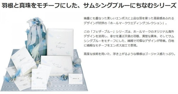 | 羽根と真珠をモチーフにしたサムシングブルーにちなむシリーズ。 |