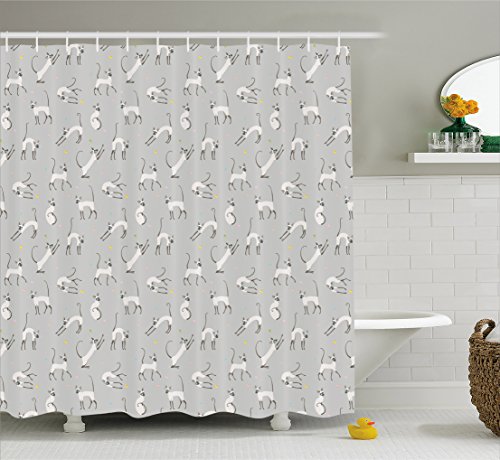 Grey Shower Curtain by Ambesonne, Cute Siamese Cat on Wall Design Playing and Posing Feline Asian Kitty Animal Design, Fabric Bathroom Decor Set with Hooks, 70 Inches, Pale Grey