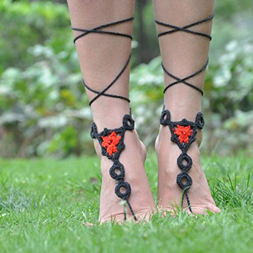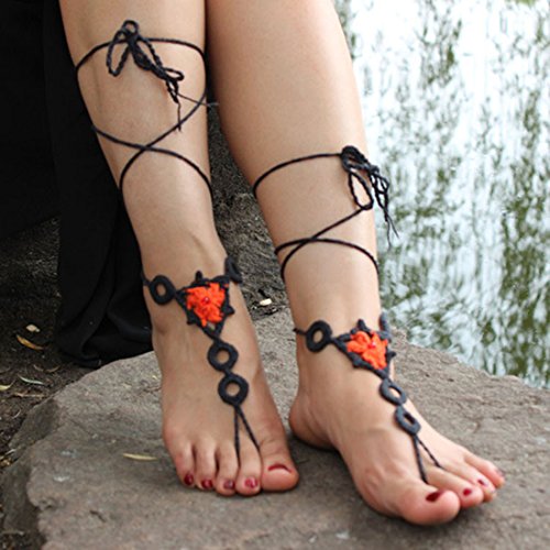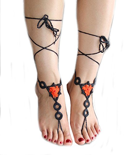 Flyusa Summer Beach Crochet Barefoot Sandals, Bridal Wedding Barefoot Sandals, Foot Jewelry, Footless Sandals, Slave Anklet, Wedding Accessories,Black Orange