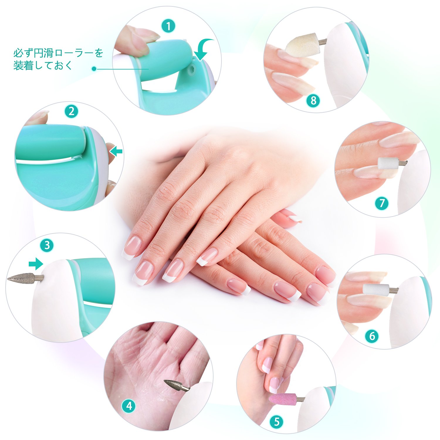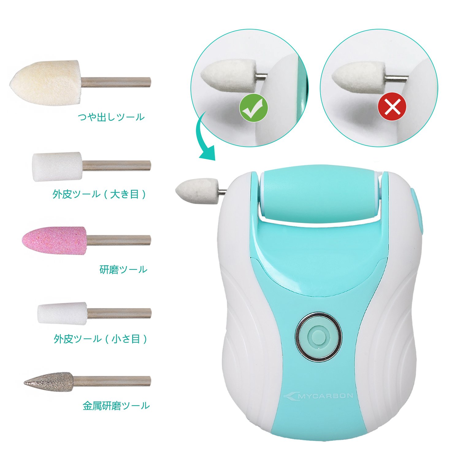 【8種のアタッチメント】粗目ローラー*2つ、滑らかなローラー*1つ、小さ目のネイルローラー*5本が付属しています。小さ目のネイルローラーは手と足のネイルを綺麗にするものです。使用時、まず滑らかなローラー(回転しないタイプ)を装着してからネイルローラーを左側の穴にしっかり差し込みます。