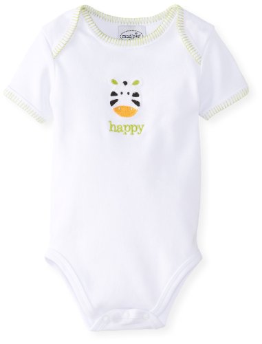 Feature : 100% cotton crawler with a crochet applique of a zebra with the word "happy" embroidered underneath. / Green whipstitch detailing at the neck and sleeves / Machine wash cold, dry flat. Do not bleach.