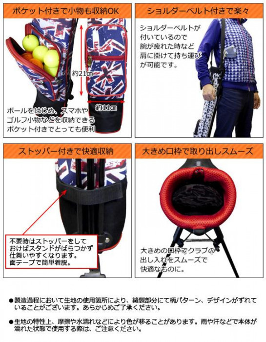 クラブを4~5本収納可能なので、セルフプレー時のクラブの持ち運びが楽になります。クラブ忘れも防止します。握りやすい大型グリップ、収納しやすいフロントポケット、グローブホルダーなど、ミニバッグとしての機能も充実!!練習場などでの使用にもおすすめです。 |