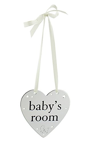 -. Feature : Beautiful silver heart shaped baby hanging plaque by Haysom Interiors. / A great gift to give someone with a new born baby or expecting. / Complete with cream satin ribbon so this decorative piece can be wall hung. / Features wording which reads "baby's room" in black text. / Overall plaque dimensions are approximately: 3" tall x 3" wide (not including ribbon).