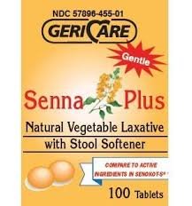 Studio : Geri-Care Pharmaceutical Corp. Publisher : Geri-Care Pharmaceutical Corp. Binding : Health and Beauty Product Description Senna Plus Natural Vegetable Laxative with Stool Softener is a gentle strength laxative plus a stool softener, for hard dry stools. Senokot-S Generic Tablets generally produces bowel movement in 6 to 12 hours. 0