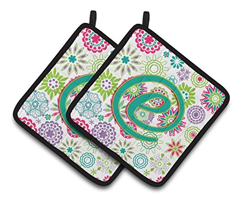 Caroline's Treasures Letter E Flowers Pink Teal green Initial Pair of Pot Holders CJ2011-EPTHD, 7.5HX7.5W, Multicolor