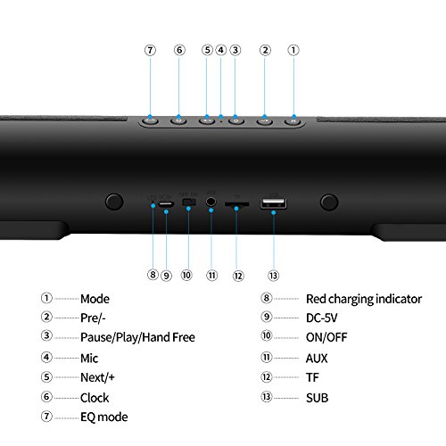 -. Feature : Multifunctional Wireless Sound Bar: Mainstream wireless playback mode, TF card playback mode and U disk playback mode, you can copy your favorite music to TF card or U disk inside, just open the speaker you can immediately hear your favorite music. Audio input mode, it supports AUX/RCA Cable. / Advanced Wireless Technology: Using BT 4.2 version, the effective distance of 10 meters or more for the market mainstream mobile phones, tablets, laptops, television and most other Wireless-specific electronic devices. / Surround Sound: Built-in double horn, with DSP bass technology, loud volume, bass boost, with 20W high-performance, you can experience your music in full-bodied stereo, perfect for home, party, picnic or other activities, take it with you to listen to music anytime, anywhere. / Home TV stereo: The long fashion appearance, just match the shape of the TV, allows you to experience the shocking sound effects and spend the warm time of your home theater with your family. / Standby Time: Built-in 2200mAh rechargeable lithium-ion batteries, more durable, you can enjoy up to 8 hours of your favorite music, 10 hours of talking time. Even long distance movement does not need to worry about the amount of electricity to fill enough, standby time for up to 5 days.
