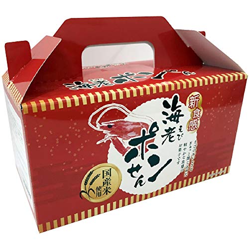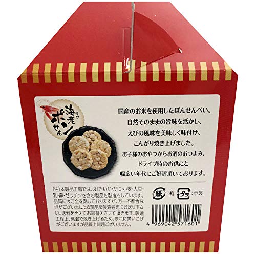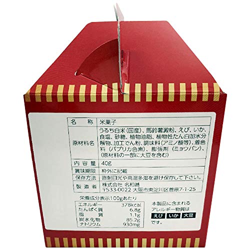原材料:うるち白米(国産)、馬鈴薯澱粉、えび、いか、食塩、砂糖、コラーゲンペプチド、植物油脂、植物性たん白加分解物、加工でん粉、調味料(アミノ酸等)、着色料(パプリカ色素)、膨張剤(ミョウバン)(原材料の一部に大豆、ゼラチンを含む)