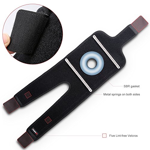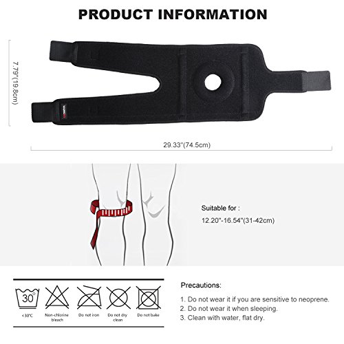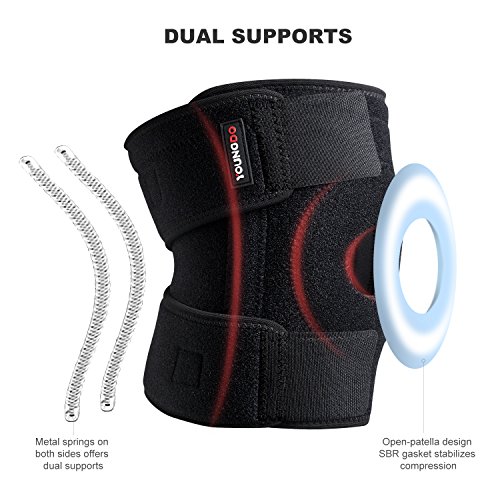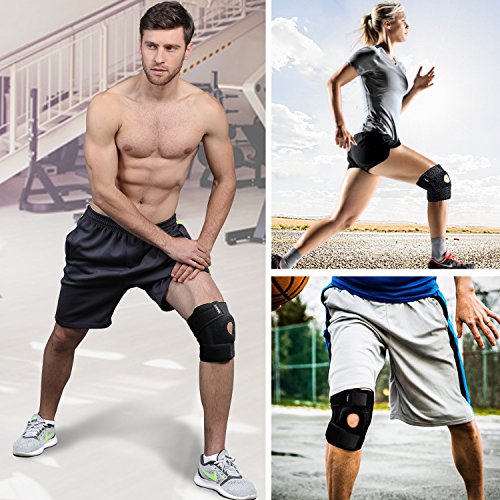 -. Feature : COMFORTABLE and BREATHABLE - Made of soft neoprene material, the knee support is comfortable and durable. The perforated interior draws away perspiration and facilitates oxygen exchange to promote blood circulation. / ANTI-SLIP - Silicone gel strips help keep everything in place during intense activities like running, walking, cycling, snowboarding, playing football, etc. / PROTECTIVE - Padded open patella design keeps the knee cap in its proper position to distribute stress across the ACL, PCL, LCL, and MCL. / PREVENTIVE - Semi-rigid inserts offer additional support during intense exercise. This brace also helps relieve pain from strain, arthritis, meniscus tears, and surgical procedures.
