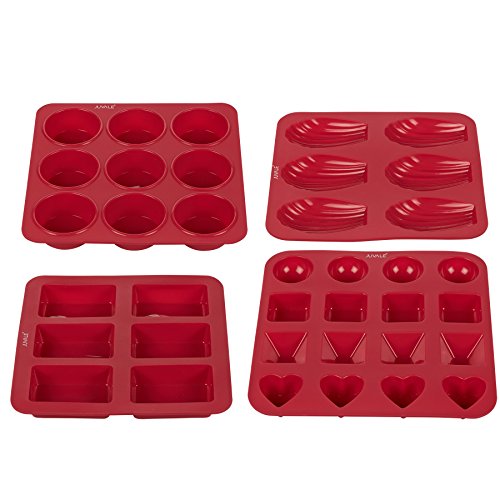- BUNDLE SET: Pack of 4 non-stick, silicone, specialty and novelty baking pans for home-made cake, chocolate, candy, cookie, soap and more; includes 1x 6-Cup Small Cake Mold, 1x 6-Cup Madeleine Mold, and 1x 9-Cup Muffin Mold, and 1x 16-Cup Assorted Chocolate Mold.