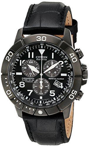 -. Feature : Eco-Drive watch in gunmetal tone featuring textured black dial with tachymeter, perpetual calendar, date window, and three subdials / 43 mm stainless steel case with mineral dial window / Japanese quartz movement with analog display / Leather calfskin band with buckle closure / Water resistant to 200 m (660 ft)