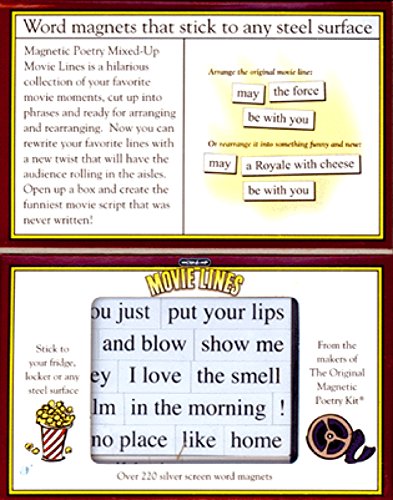 -. Binding : Kitchen -. Brand : Magnetic Poetry -. Color : White -. EAN : 0602394031549 -. Feature : Mixed-Up Movie Lines features loads of your favorite movie lines made for hilarious rearranging. / Kit contains over 200 themed magnetic word tiles / Tile height is .375" / Package size is 4.75w x 3h x 1.25 d Inches / Made in USA -. Label : Magnetic Poetry -. Manufacturer : Magnetic Poetry -. Model : 3154 -. MPN : 3154 -. PackageQuantity : 1 -. PartNumber : 3154 -. ProductGroup : Kitchen -. ProductTypeName : KITCHEN -. Publisher : Magnetic Poetry -. Size : 4.75" x 3" x 1.25" -. Studio : Magnetic Poetry -. Title : Magnetic Poetry Mixed-Up Movie Lines -. UPC : 602394031549