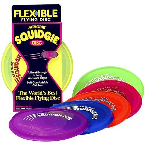 Squidgie Disc from Aerobie features a spoiler rim designed for long, accurate flights. The flexible edge improves grip and allows for soft catches. The 8" diameter is perfect for veteran disc throwers or novices. Ideal around water hazards, it floats! Colors may vary. Made in the U.S.A. Ages 5 and up.