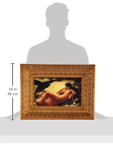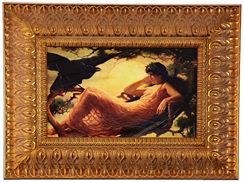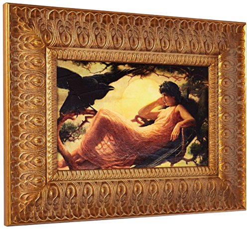 Awash in a yellow-gold sunset, a breathtakingly beautiful maiden falls under the magic spell of the raven, harbinger of mystic transformation. The authentic stretched canvas replica painting captures the original work's texture, depth of color, and even its bold brushstrokes, which are applied by hand exclusively for Design Toscano. The imported, delicately carved hardwood frame boasts a delicate leaf motif with fine feathered detailing finished in antique gold tones. Small: 22"Wx17"H.Feature