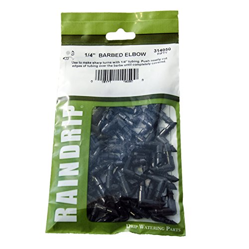 -. Binding : Lawn & Patio -. Brand : Raindrip -. EAN : 0018171140500 -. Feature : Use to connect 2 sections of 1/4" tubing in order to direct water to another location or connect 1/4" tubing to a supply line / Exclusive design allows use with higher water pressures up to 50 PSI / Built to last -. Label : Raindrip -. Manufacturer : Raindrip -. Model : 314050B -. MPN : 314050B -. PackageQuantity : 1 -. PartNumber : 314050B -. ProductGroup : Lawn & Patio -. ProductTypeName : OUTDOOR_LIVING -. Publisher : Raindrip -. SKU : FHHY0770318 -. Studio : Raindrip -. Title : Raindrip 314050B Barbed Elbows, 1/4-Inch, 50 Per Bag -. UPC : 018171140500