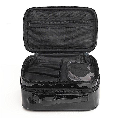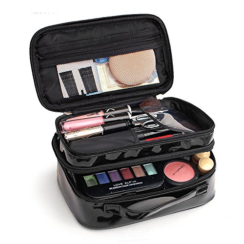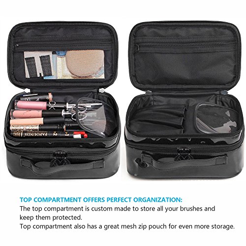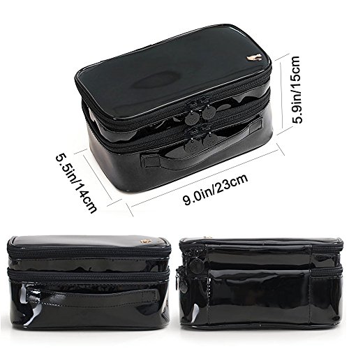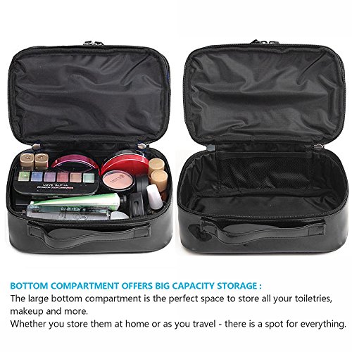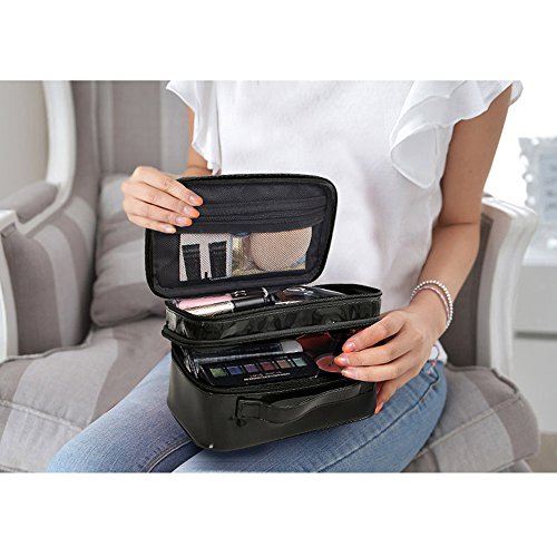 - QUALITY COSMETIC BAG: This makeup cosmetic bag is made of high quality PU Leather, and with durable handle and quality Dual - Direction zipper, 2 layer makeup organizer give you enough capacity to organize your personal and professional beauty items : makeup brushes, foundation , eyebrow pencil , eyeliner, creams , lotions and cosmetics , etc