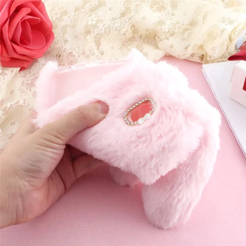 Features:3D Lovely Cartoon Warm Plush Fluffy pet rabbit Long ears phone case
