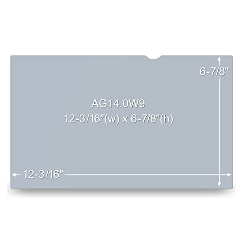 - Feature : Helps reduce glare and mirror-like reflections which makes your screen easier to use in high-glare situations / Designed to fit widescreen laptops with a diagonally measured 14" viewing screen and a 16:9 aspect ratio / Actual filter dimensions are 12 3/16" wide x 6 7/8" high (310 mm x 175 mm) / Easy to apply, removable and re-attachable. No lamination, no bubbles. / Lightweight, thin, frameless design / Protects screen against scratches / Attaches with optically clear adhesive strips that can easily be applied and reapplied numerous times / Easy to clean; includes cleaning cloth / Compatible with most touchscreen displays / Limited 1-year warranty / Helps reduce glare and mirror-like reflections which makes your screen easier to use in high-glare situations. / Easy to apply; removable and re-attachable. Includes two forms of attachment strips. No lamination, no bubbles. / Includes cleaning cloth and optically clear adhesive strips that can easily be applied and reapplied numerous times. / Protects screen against scratches. / Compatible with most touch-screen displays. / Easy to clean. Hides fingerprints. / Filter made in USA