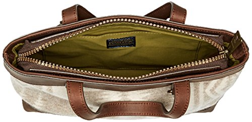Pendleton famous 1923 pattern in versatile neutrals. Zip top, interior pocket, adjustable/removable strap. Leather trim. Random horizontal pattern placement.