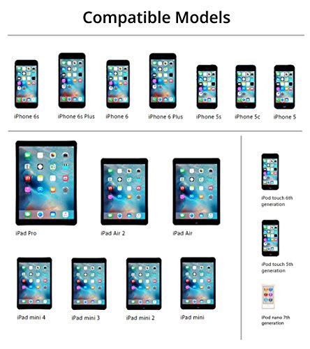 [Works With]: Fast Charge and Rapid Sync for iPhone 6s 6sPlus 6 6Plus 5s 5c 5 SE, iPad Pro Air2 Air, iPad mini4 mini3 mini2 mini, iPad 4, iPod touch6 touch5, ipod nano7 and other lightning based devices.